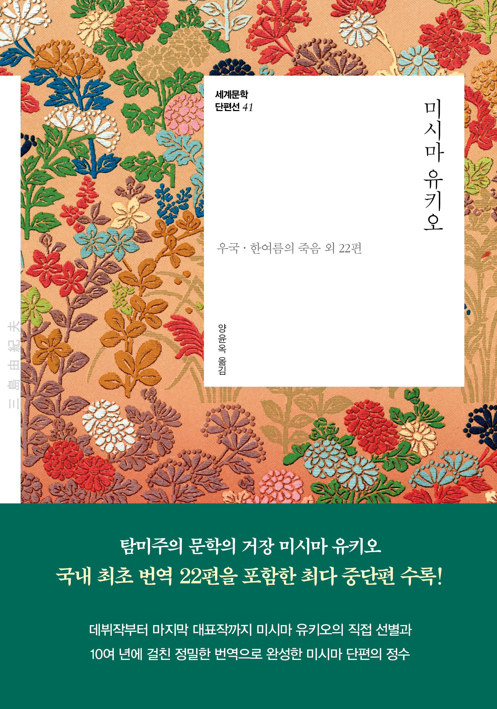 16세에 동인지에 발표하며 미시마 유키오라는 필명을 알린 「꽃이 한창인 숲」과 21세에 가와바타 야스나리의 추천으로 문단에 정식 데뷔한 작품 「담배」를 비롯해, 도입부부터 비극적인 사건이 휘몰아치며 몰입을 유발하는 「한여름의 죽음」, 할복자살을 묘사해 충격과 논쟁을 불러일으킨 작품 「우국」 등 미시마 유키오는 20대와 30대 초중반 내내 왕성하게 단편소설을 발표했다. 1970년 45세의 나이로 사망하기까지 남긴 단편이 무려 144편에 이르는데, 그 수많은 작품 중에서 무엇부터 읽어야 할지 고민하는 독자들에게 길잡이가 되어줄 책이 바로 이 단편선이다.
